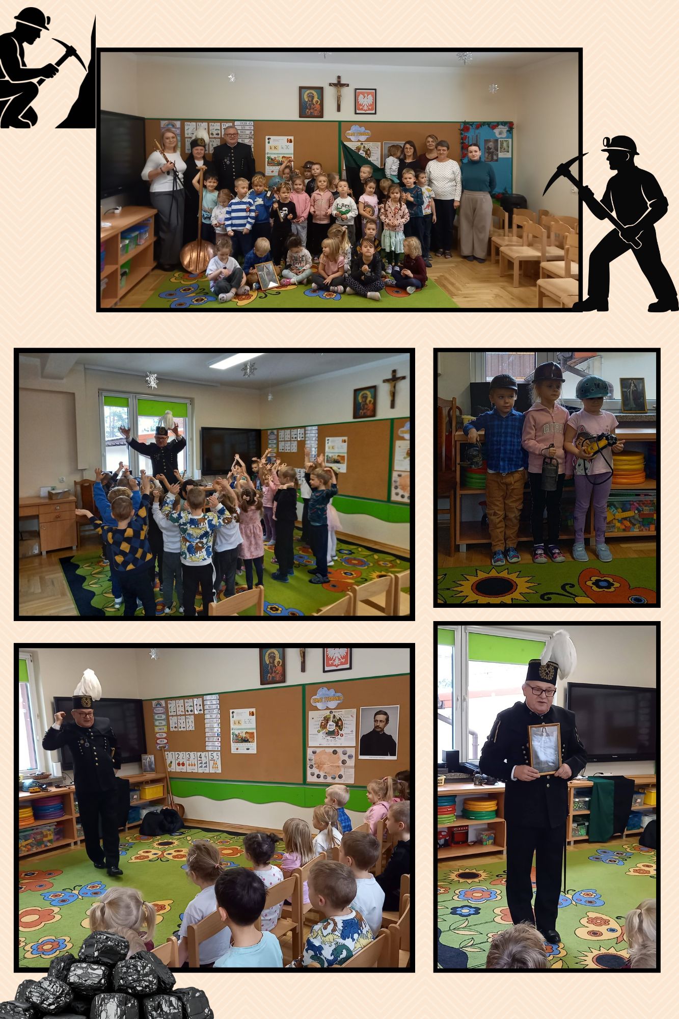 28 listopada nasze przedszkole odwiedził Damian Wilczek, który w ciekawy sposób opowiedział dzieciom o pracy górnika. Przedszkolaki dowiedziały się, jak wyglądała codzienność w kopalni, jakie zadania wykonywano pod ziemią oraz jak ważną rolę w górniczych tradycjach odgrywa święta Barbara. Gość pokazał również dawne narzędzia, wyjaśniając, do czego były używane. Duże zainteresowanie wzbudziła opowieść o zwierzętach pracujących w kopalniach zwłaszcza o koniach, które pomagały w transporcie węgla. Sporo emocji wywołała prezentacja stroju galowego. Dzieci mogły dowiedzieć się, z jakich elementów się składa, jakie znaczenie mają poszczególne detale oraz dlaczego kolor czarny jest tak charakterystyczny dla górników. Szczególną uwagę przyciągnęła czapka z pióropuszem, a nasz gość wyjaśnił, co oznaczają różne kolory pióropuszy i jakie stanowiska symbolizują.